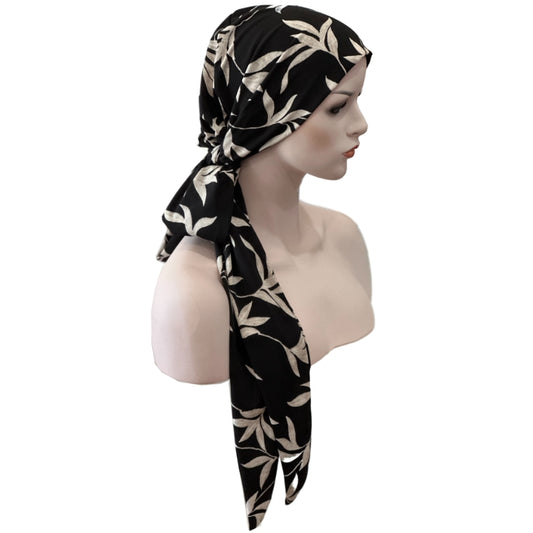 BO-HO STYLE - Chemo Cap with Attached Long Ties - Prints - Black with White FrondsRegular price $49.95 AUDRegular priceUnit price / per$49.95 AUDSale price $49.95 AUD